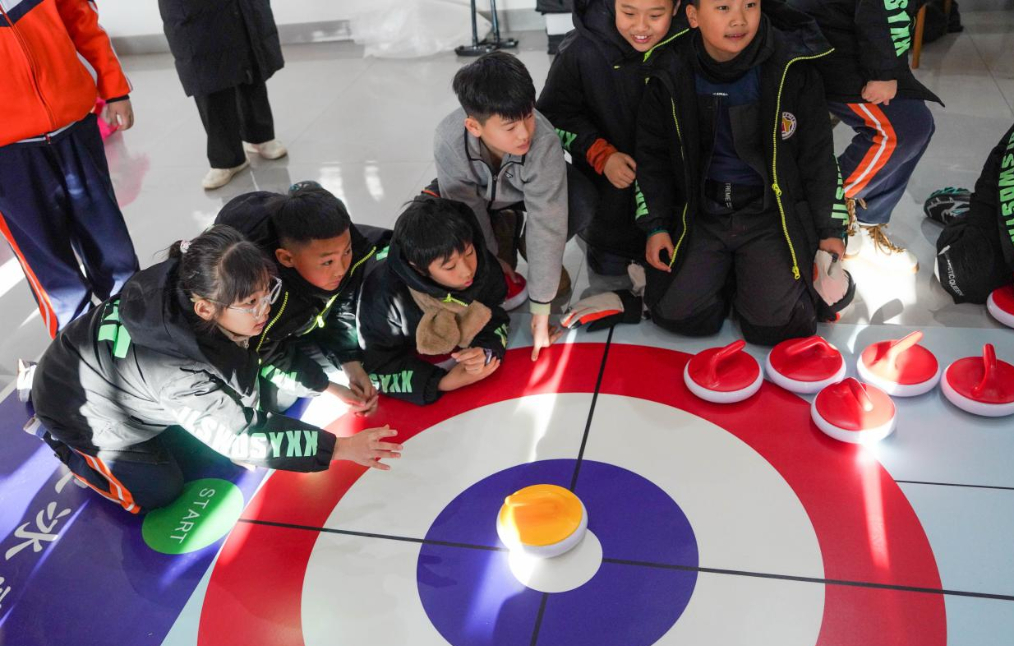 12月3日,吉林市松江东路小学校学生在吉林市纳美山谷度假区体验旱地冰壶。新华社记者 颜麟蕴 摄
